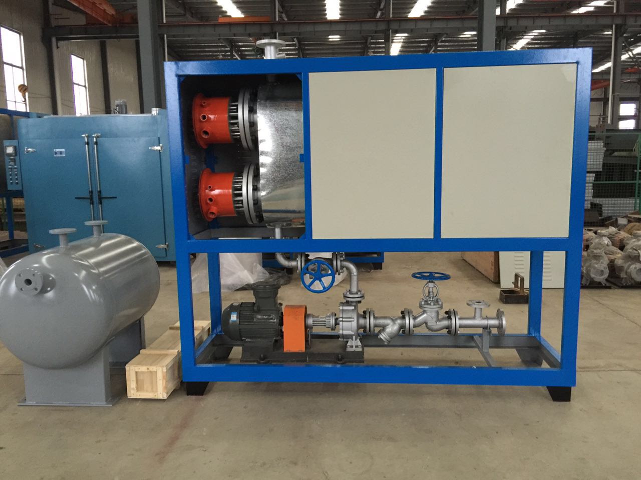 導(dǎo)熱油爐排氣流程: 1、導(dǎo)熱油通過(guò)膨脹槽注油口處加注,并通過(guò)膨脹口管道流入設(shè)備及油爐本體內(nèi),此時(shí)注油時(shí)一定要打開(kāi)系統(tǒng)中所有的閥門(放油閥除外),讓導(dǎo)熱油流入筒體及需加熱設(shè)備內(nèi)。 2、當(dāng)液面顯示約為膨脹槽高度1/2時(shí),停止注油。 3、首 行常溫排氣:接通電源,打開(kāi)導(dǎo)熱油加熱器的進(jìn)出口閥門及排氣閥(膨脹管道閥門需一直開(kāi)著以及時(shí)補(bǔ)充油量),按動(dòng)油泵啟動(dòng)按鈕,油泵運(yùn)行,油泵應(yīng)按箭頭指示方向正常運(yùn)行,壓力表壓力顯示在規(guī)定范圍內(nèi),視聽(tīng)油泵運(yùn)行情況,如有異,F(xiàn)象應(yīng)立即停機(jī)檢查,將故障排除后再重新起動(dòng)油泵,進(jìn)行常溫下排氣,直至壓力表指示穩(wěn)定。進(jìn)行常溫排氣時(shí),要注意觀察膨脹槽內(nèi)的液位,當(dāng)?shù)陀谝?guī)定的液位高度時(shí)要及時(shí)進(jìn)行補(bǔ)充。 4、升溫脫水:在確認(rèn)常溫下運(yùn)行正常后,即可進(jìn)行升溫脫水排氣(操作前詳閱導(dǎo)熱油使用說(shuō)明書(shū)及溫控儀使用說(shuō)明書(shū)),升溫脫水排氣可按如下步驟進(jìn)行: 步:升溫至100-120℃保溫 開(kāi)始升溫時(shí),應(yīng)該控制升溫速度在50℃/h以內(nèi),并且監(jiān)視壓力表顯示是否正常,如發(fā)現(xiàn)無(wú)壓力或壓力不穩(wěn),說(shuō)明系統(tǒng)內(nèi)仍有殘留氣體,此時(shí)要求按3要求重復(fù)進(jìn)行常溫排氣操作,待系統(tǒng)壓力穩(wěn)定后方可繼續(xù),升溫至120℃后進(jìn)行長(zhǎng)時(shí)間保溫,保溫時(shí)間的長(zhǎng)短與系統(tǒng)總?cè)萘考皩?dǎo)熱油的質(zhì)量有關(guān)。  第二步:升溫至150-180℃保溫。  排除油中輕組分、揮發(fā)物及殘余水分,請(qǐng)參照KRD系列導(dǎo)熱油加熱器系統(tǒng)脫水排氣曲線圖操作 第三步:脫水排氣完成后要關(guān)閉排氣閥(其它閥門無(wú)需關(guān)閉),投入正常升溫運(yùn)行。 5、 升溫脫水排氣過(guò)程有關(guān)事項(xiàng)。 升溫過(guò)程中管路可能會(huì)發(fā)出碰擊的響聲,說(shuō)明系統(tǒng)內(nèi)有大量氣體或管道不暢,此時(shí)要降低升溫速度,待氣體排除便可消除聲響;如系管道不暢所至應(yīng)予以排除。 脫水排氣過(guò)程可能會(huì)有大量氣體涌入膨脹槽,造成槽內(nèi)導(dǎo)熱油外溢,操作前要在溢油管下安置好溢油容器。 進(jìn)行脫水排氣時(shí),現(xiàn)場(chǎng)必須有人員看守,發(fā)現(xiàn)異常及時(shí)處理。   對(duì)于所提的油泵無(wú)油或少許油流出的問(wèn)題,解決方案如下: 1、 關(guān)閉出油口閥門,啟動(dòng)油泵,觀察壓力表顯示情況,若無(wú)壓力,則說(shuō)明回油口無(wú)油補(bǔ)充油泵,使得油泵空轉(zhuǎn),無(wú)后續(xù)油及時(shí)補(bǔ)充,則請(qǐng)貴司檢查一下回油口的供油情況,此時(shí)請(qǐng)確保膨脹槽里有油并膨脹管道閥門打開(kāi)和需熱設(shè)備有油并出油口閥門在打開(kāi)狀態(tài)。 2、 如果以上要求都執(zhí)行到位,壓力表還無(wú)壓力,請(qǐng)檢查油爐上的油泵、截止閥及過(guò)濾器是否堵塞。 3、 若壓力表顯示壓力值,而油泵、截止閥及過(guò)濾器并無(wú)堵塞,那油爐的出油口一定會(huì)按油泵所提供的流量進(jìn)行流出。
